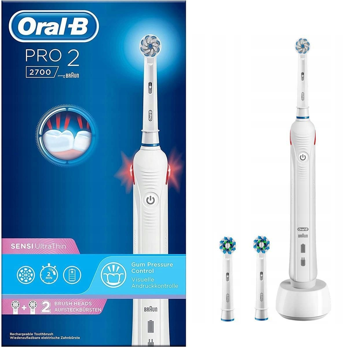 Oral-B PRO 2 2700 Szczoteczka Elektryczna + 2 Główki Wymienne Sensi Ultra Thin, która usuwa do 100% więcej płytki nazębnej niż zwykła szczoteczka manualna, poprawiając stan dziąseł oraz sprawia, że Twój uśmiech staje się bielszy już od pierwszego dnia szczotkowania dzięki usuwaniu przebarwień powierzchniowych. Co więcej, szczoteczka pomaga chronić delikatne dziąsła dzięki personalizowanej technologii kontrolującej siłę nacisku, która zmniejsza prędkość szczotkowania oraz ostrzega, gdy szczotkujesz zbyt mocno.