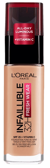 L'Oreal Infaillible Fresh 32H Wear długotrwale kryjący podkład do twarzy z dodatkowym efektem rozświetlania, pozwoli Ci się cieszyć niezawodnym makijażem aż do 32H. Świeża, naturalna skóra przez cały dzień, a nawet dłużej to efekt lekkiej i oddychającej formuły podkładu, odpornej na ścieranie i zmianę koloru. Dzięki niej makijaż sprawdzi się idealnie także przy noszeniu i zdejmowaniu maseczki i zapewni nieskazitelną, promienną cerę, nawet po wysiłku fizycznym.