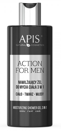 Apis Professional Natural Cosmetics Action For Men Nawilżający Żel Do Mycia 3w1, przeznaczony dla każdego rodzaju skóry. Linia perfumowana. Łagodny żel pod prysznic dla mężczyzn o zniewalającym i długotrwałym zapachu przeznaczony do codziennej pielęgnacji ciała, twarzy i włosów. Linia Action For Men inspirowana znanym i cenionym na całym świecie perfumem Paco Rabanne Invictus. Action For Men Zawiera aktywne substancje myjące i odżywczo-nawilżające: kwas hialuronowy, d-panthenol (prowitamina B5), kompleks Hydromanil™ i ekstrakty z aloesu, lnu, żeń-szenia. Żel doskonale myje i odświeża jednocześnie odżywiając i nawilżając skórę i włosy.