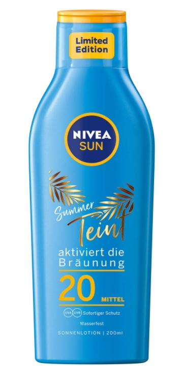 NIVEA SUN Summer Teint Lotion LSF 20 LE zapewnia wysoce skuteczną i natychmiastową ochronę przed promieniowaniem UVA/UVB oraz piękną i równomierną opaleniznę bez użycia samoopalacza. Krem do opalania aktywuje naturalny proces opalania skóry dzięki zawartemu w nim ekstraktowi z pro-melaniny. Aby uzyskać najlepsze efekty opalania, krem do opalania Summer Teint należy stosować regularnie. Dodatkowo lekka i nietłusta formuła jest wodoodporna. Zgodność ze skórą potwierdzona dermatologicznie. Formuła jest zgodna z ustawą Hawaiian Reef Law, ponieważ jest wolna od oktinoksatu i oksybenzonu.