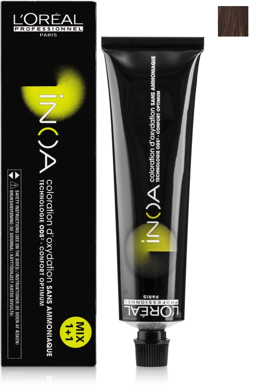 L’Oreal Professionnel INOA Innowacyjny systemem stworzony dla profesjonalnej koloryzacji włosów. Farba na bazie oleju, dzięki czemu zapewnia dogłębne nawilżenie i odżywienie pozostawiające włosy wyjątkowo miękkie i pełne blasku. Dodatkowo ma delikatną formułę pozbawioną amoniaku. Dzięki zastosowaniu technologii ODS2 (Oil Delivery System2) farba nie tylko zapewnia głęboki i intensywny kolor, ale także chroni i pielęgnuje włókno włosa (pozwala zachować naturalny poziom lipidów i aminokwasów). Formuła bez amoniaku i bez zapachu zapewnia koloryzacje do 6 tygodni i do 100% pokrycia siwych włosów oraz rozjaśnienie do 3 tonów w 35 min.